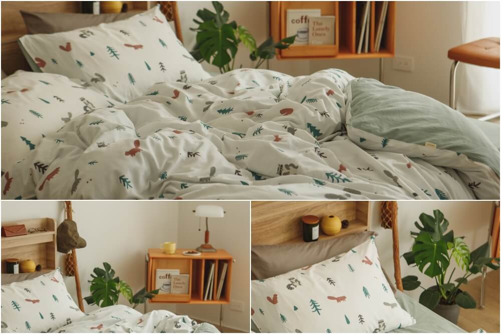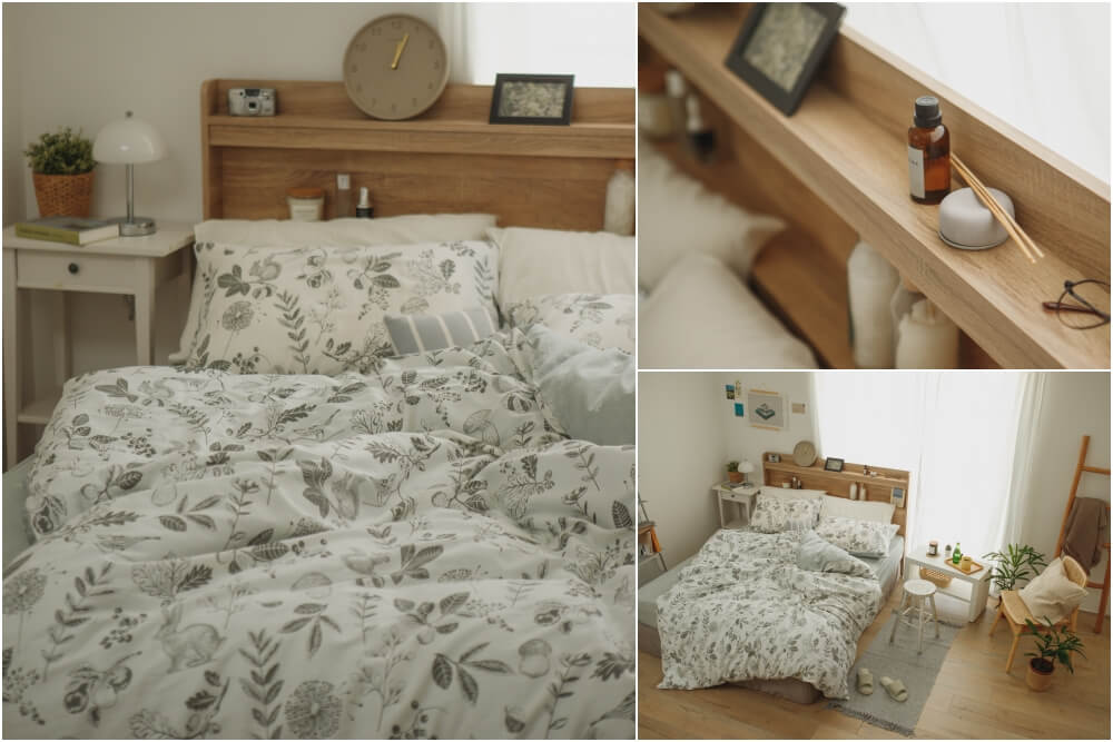 卉之森純棉床包搭配傢俱建議以白色、灰色、淺木色調為主,幫助打造清新明亮的自然系路線,再加上室內香氛就更有大自然的氛圍了,工作的疲憊完全被療癒了。