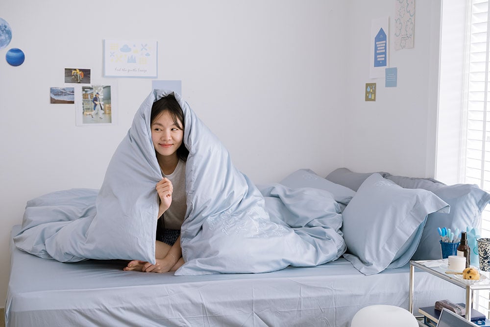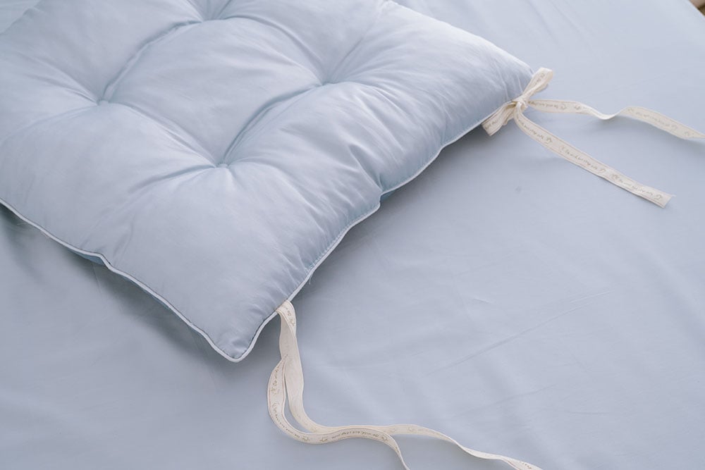 夏夢日記的藍是屬於柔和的霧藍色,帶了一點點的灰調,搭配天絲棉的光澤感,看起來高級感十足。