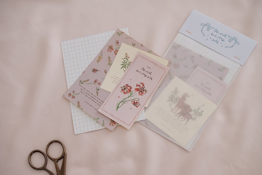 春日拾光是淡淡的粉色為基底,溫柔卻不會感到過於甜膩,上面的印花是由野小百合、狀元紅、油菜花、魯冰花等植物組成。