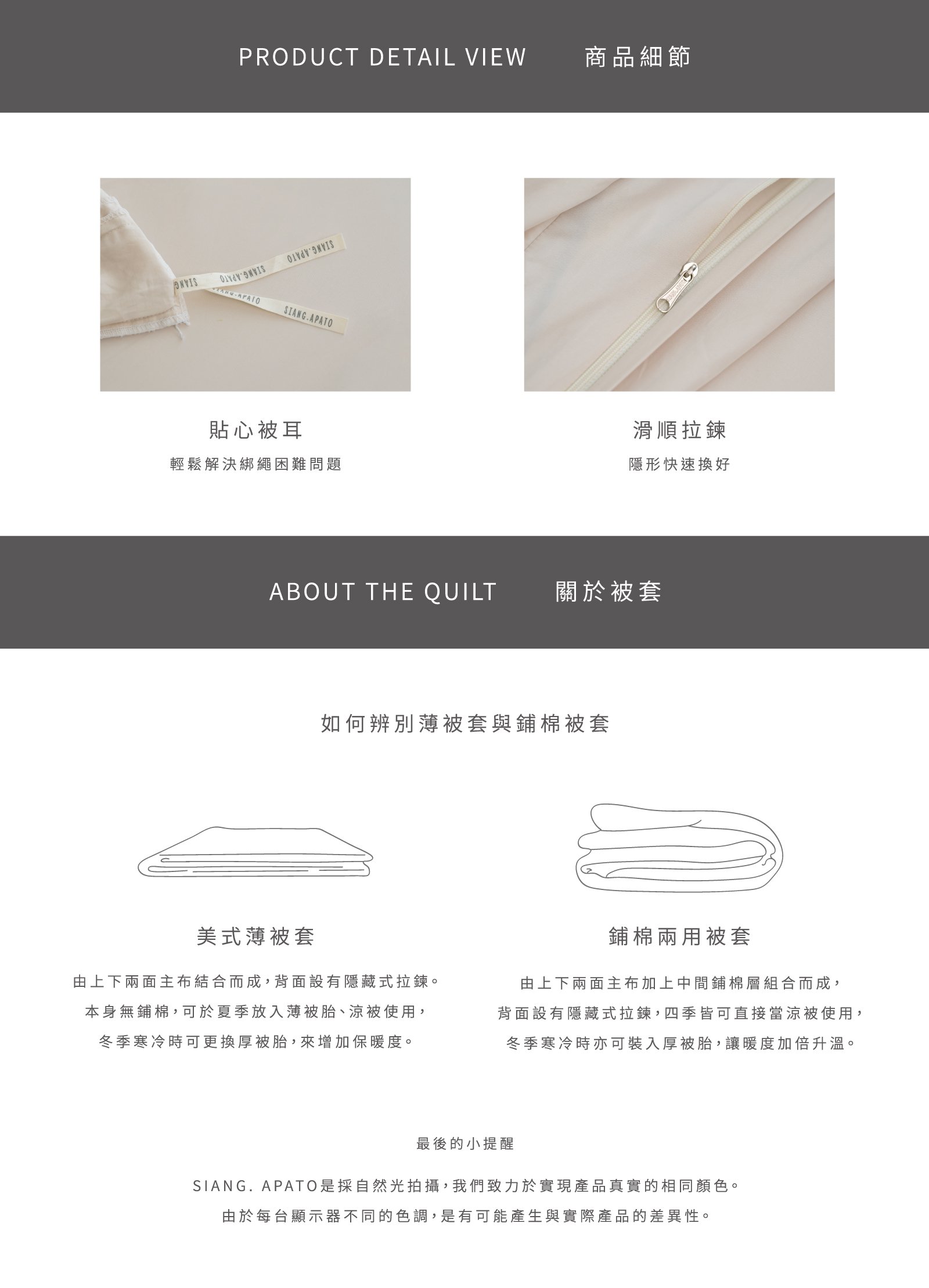 秘蜜日記 - 天絲棉被套 / Sybil-Ho 聯名款 NT$6,300 NT$ 3,150 可國外配送 可國外配送 「願所有美好事物伴你同行,將溫暖傳遞到旅途中每個角落。」 ◆ 61%天絲+39%長絨棉 ,吸濕透氣、手感紮實 ◆ 升級萊賽爾Micro纖維,更加細緻柔滑 ◆ Made in Taiwan 台灣製造,品質安心 NT$6,300 NT$ 3,150 #天絲#棉被#被套#聯名#天絲棉#刺繡#素色 尺寸 單人雙人 規格 薄被套鋪棉兩用被套 床包尺寸 寬 長 高 公分 床包鋪棉 需要 不需要 被套尺寸 寬 長 公分 被套鋪棉 需要 不需要 價格試算 數量 加入購物車 立即購買 優惠活動 消費滿 990元 即可用優惠價格加購商品 台中購物節合作5倍店家|官網及北屯門市限定! Line詢問 商品細節 尺寸指南 洗滌方式 商品評價(0)