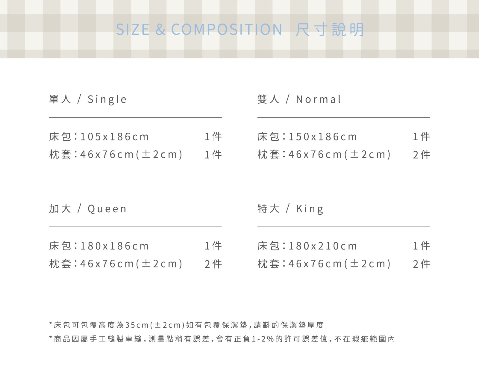 BAKERY - 雙層紗床包組 ( 床包 + 枕套 ) / Second Morning 正版授權 NT$3,760 NT$ 1,880 「蓬鬆柔軟,新鮮出爐。」 ◆ Second Morning 正版授權,100%長絨棉製成 ◆ 二重紗/雙層紗材質,蓬鬆透氣 ◆ 細緻刺繡,增添獨特感 NT$3,760 NT$ 1,880 #二重紗(雙層紗)#床包組#單人床包#雙人床包#雙人加大床包#雙人特大床包#刺繡 尺寸 單人雙人加大特大 床包尺寸 寬 長 高 公分 床包鋪棉 需要 不需要 被套尺寸 寬 長 公分 被套鋪棉 需要 不需要 價格試算 數量 加入購物車 立即購買 優惠活動 聖誕好眠. 長絨棉系列88折 消費滿 990元 即可用優惠價格加購商品 台中購物節合作5倍店家|官網及北屯門市限定! Line詢問 商品細節 尺寸指南 洗滌方式 商品評價(0)