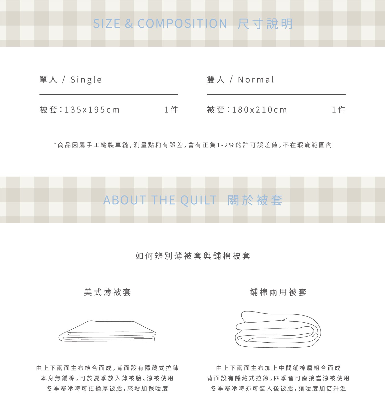 BAKERY - 雙層紗被套 / Second Morning 正版授權 NT$4,760 NT$ 2,380 「蓬鬆柔軟,新鮮出爐。」 ◆ Second Morning 正版授權,100%長絨棉製成 ◆ 二重紗/雙層紗材質,蓬鬆透氣 ◆ 細緻刺繡,增添獨特感 NT$4,760 NT$ 2,380 #二重紗(雙層紗)#棉被#被套#刺繡 尺寸 雙人單人 規格 薄被套鋪棉兩用被套 床包尺寸 寬 長 高 公分 床包鋪棉 需要 不需要 被套尺寸 寬 長 公分 被套鋪棉 需要 不需要 價格試算 數量 加入購物車 立即購買 優惠活動 聖誕好眠. 長絨棉系列88折 消費滿 990元 即可用優惠價格加購商品 台中購物節合作5倍店家|官網及北屯門市限定! Line詢問 商品細節 尺寸指南 洗滌方式 商品評價(0)