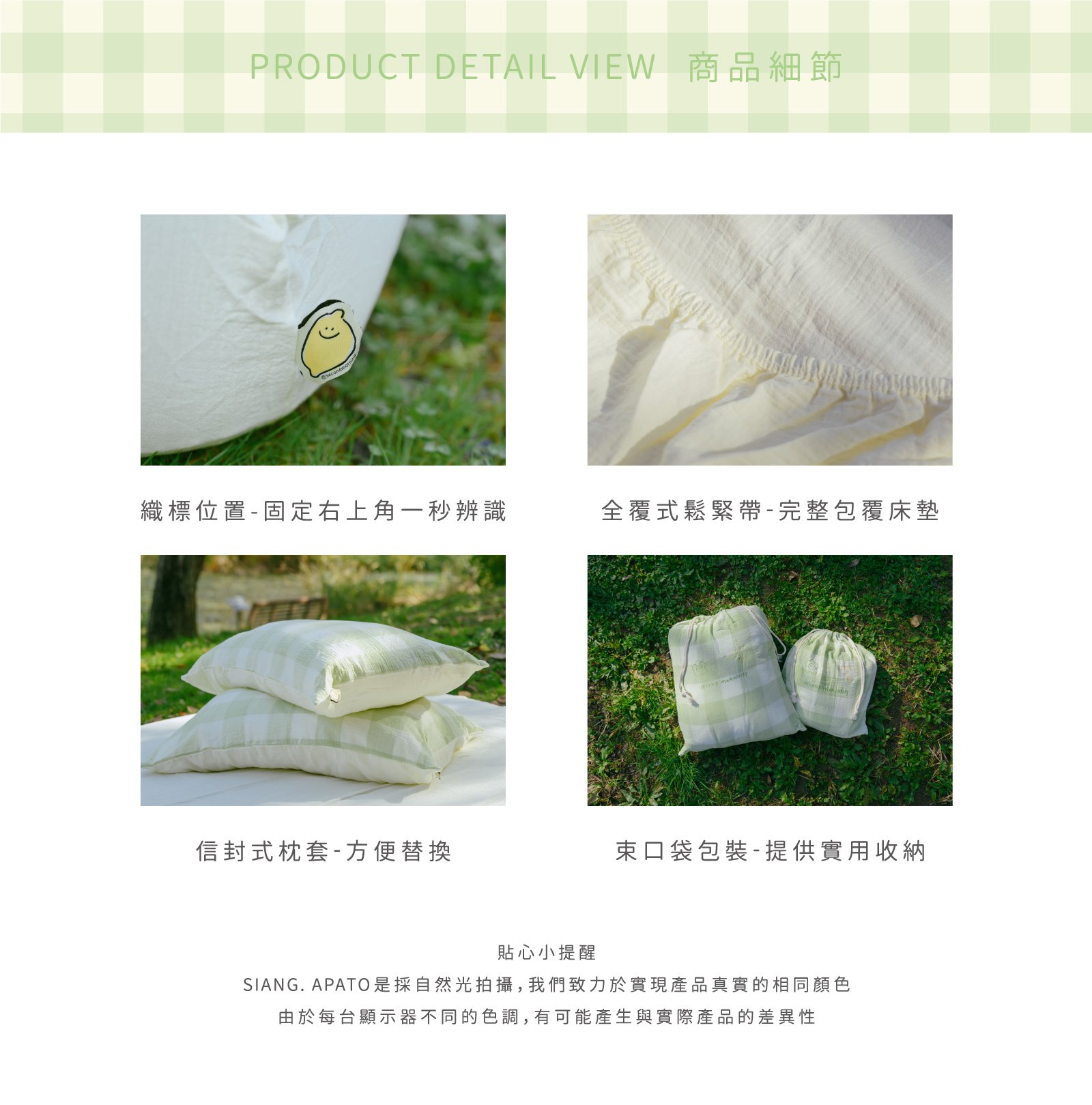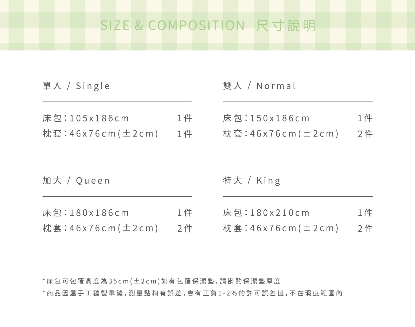GREENERY DAY - 雙層紗床包組 ( 床包 + 枕套 ) / Second Morning 正版授權 NT$3,760 NT$ 1,880 「綠色是最健康的顏色。」 ◆ Second Morning 正版授權,100%長絨棉製成 ◆ 二重紗/雙層紗材質,蓬鬆透氣 ◆ 細緻刺繡,增添獨特感 NT$3,760 NT$ 1,880 #二重紗(雙層紗)#床包組#單人床包#雙人床包#雙人加大床包#雙人特大床包#刺繡 尺寸 單人雙人加大特大 床包尺寸 寬 長 高 公分 床包鋪棉 需要 不需要 被套尺寸 寬 長 公分 被套鋪棉 需要 不需要 價格試算 數量 加入購物車 立即購買 優惠活動 聖誕好眠. 長絨棉系列88折 消費滿 990元 即可用優惠價格加購商品 台中購物節合作5倍店家|官網及北屯門市限定! Line詢問 商品細節 尺寸指南 洗滌方式 商品評價(0)