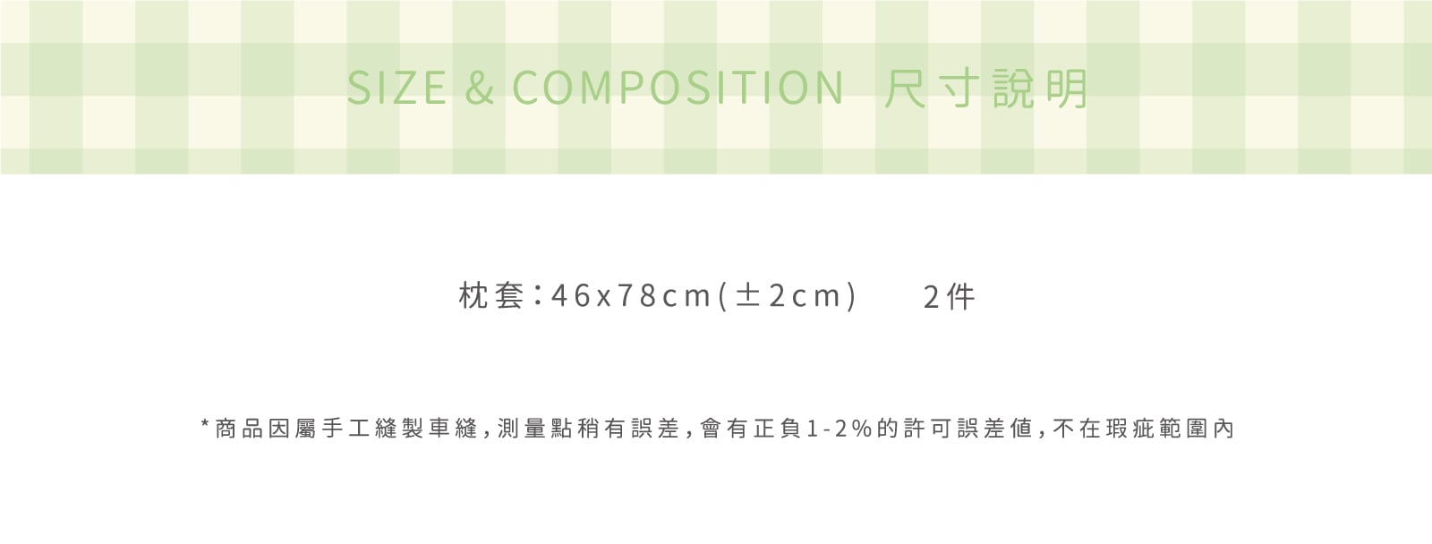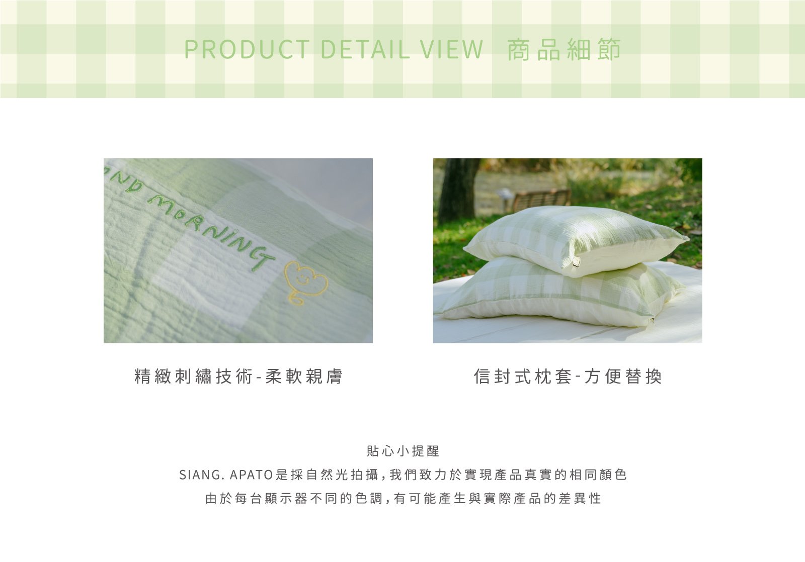 GREENERY DAY - 雙層紗枕套 / 2入組 / Second Morning 正版授權 NT$1,500 NT$ 750 「綠色是最健康的顏色。」 ◆ Second Morning 正版授權,100%長絨棉製成 ◆ 二重紗/雙層紗材質,蓬鬆透氣、吸濕性強 ◆ 細緻刺繡,增添獨特感 NT$1,500 NT$ 750 #二重紗(雙層紗)#枕套#刺繡 床包尺寸 寬 長 高 公分 床包鋪棉 需要 不需要 被套尺寸 寬 長 公分 被套鋪棉 需要 不需要 價格試算 數量 加入購物車 立即購買 優惠活動 聖誕好眠. 長絨棉系列88折 消費滿 990元 即可用優惠價格加購商品 台中購物節合作5倍店家|官網及北屯門市限定! Line詢問 商品細節 尺寸指南 洗滌方式 商品評價(0)