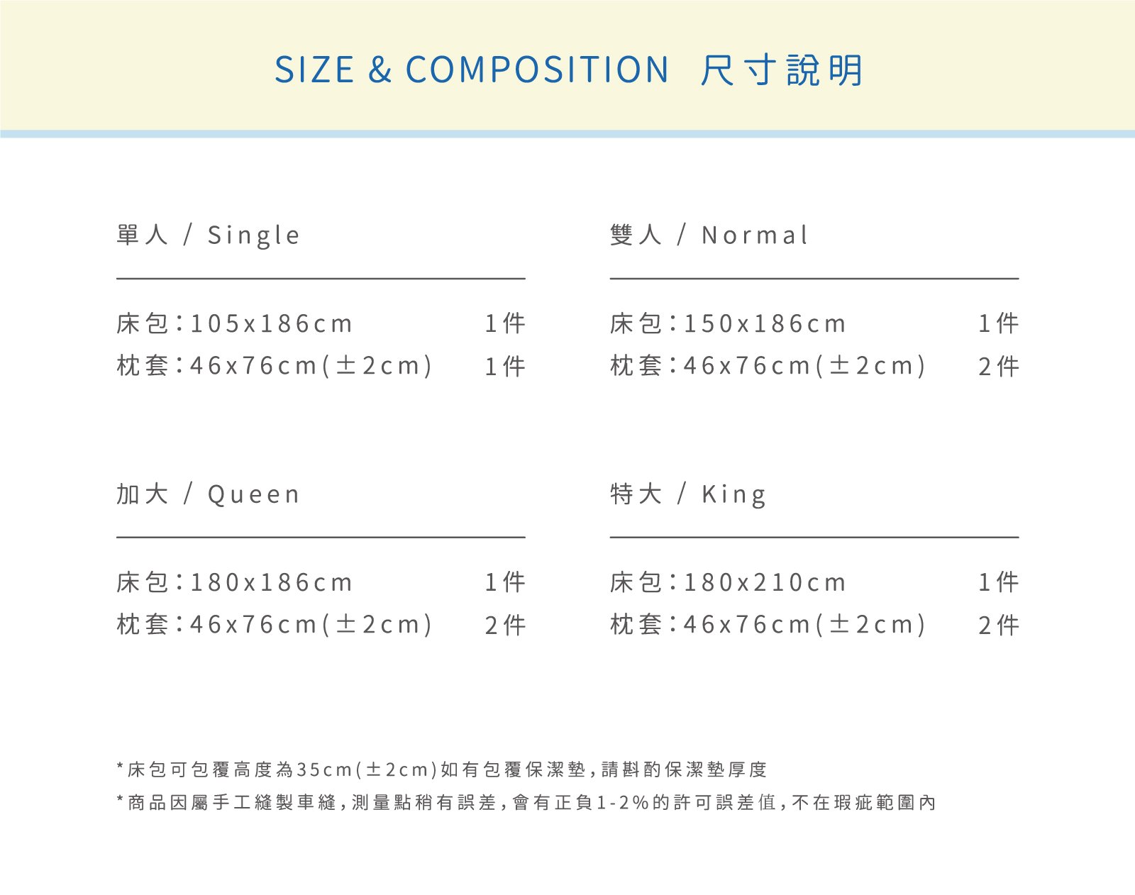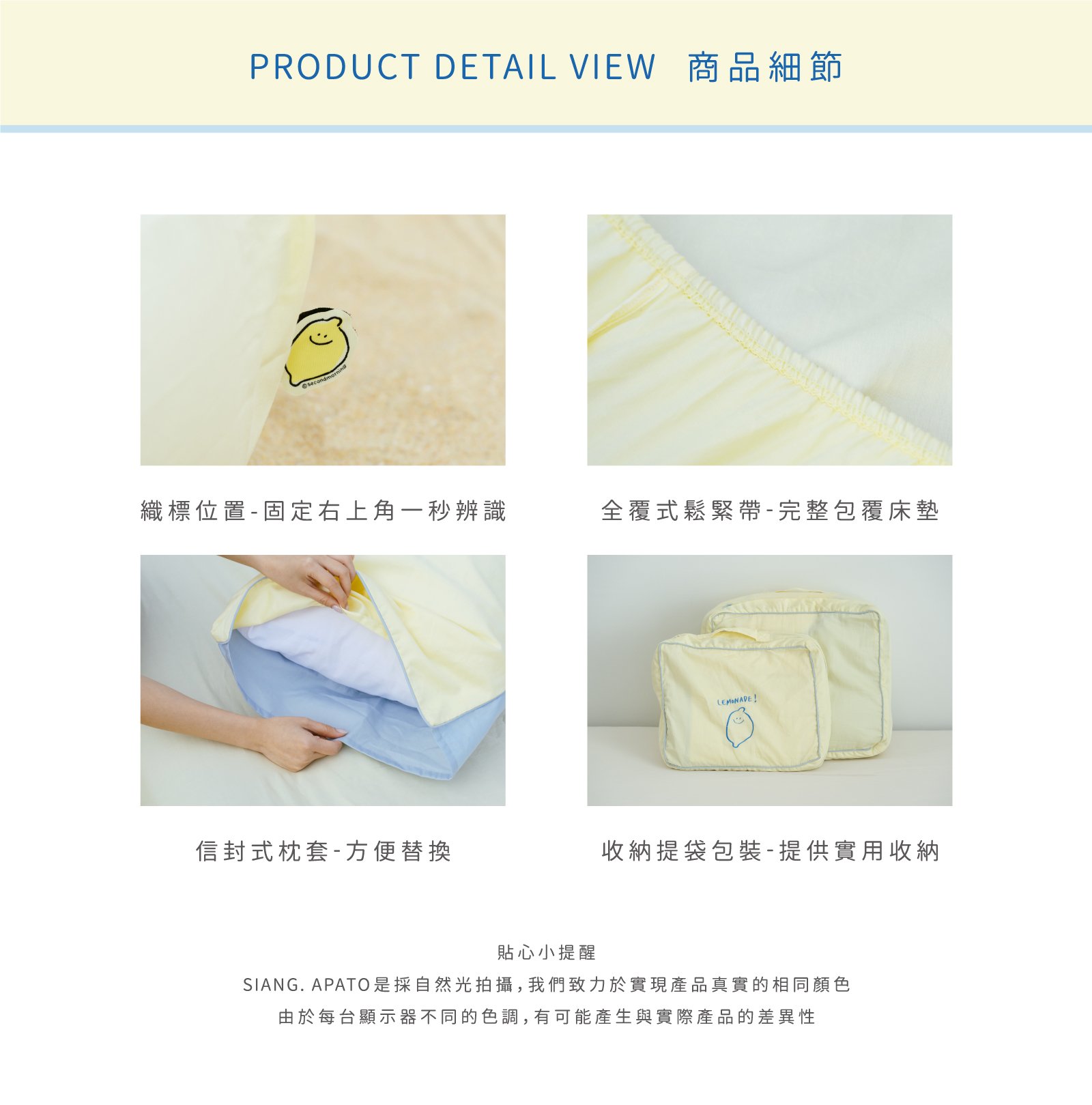 LEMONADE - 60支長纖棉床包組 ( 床包 + 枕套 ) / Second Morning 正版授權 NT$3,760 NT$ 1,880 「猜猜看誰是世界上最甜的檸檬~?」 ◆ Second Morning 正版授權,100%長絨棉製成 ◆ 表面絲光工藝,觸感滑順、自帶光澤 ◆ 獨特毛巾繡,蓬鬆柔軟 NT$3,760 NT$ 1,880 #床包組#單人床包#雙人床包#雙人加大床包#雙人特大床包#長絨棉 尺寸 單人雙人加大特大 床包尺寸 寬 長 高 公分 床包鋪棉 需要 不需要 被套尺寸 寬 長 公分 被套鋪棉 需要 不需要 價格試算 數量 加入購物車 立即購買 優惠活動 聖誕好眠. 長絨棉系列88折 消費滿 990元 即可用優惠價格加購商品 台中購物節合作5倍店家|官網及北屯門市限定! Line詢問 商品細節 尺寸指南 洗滌方式 商品評價(0)
