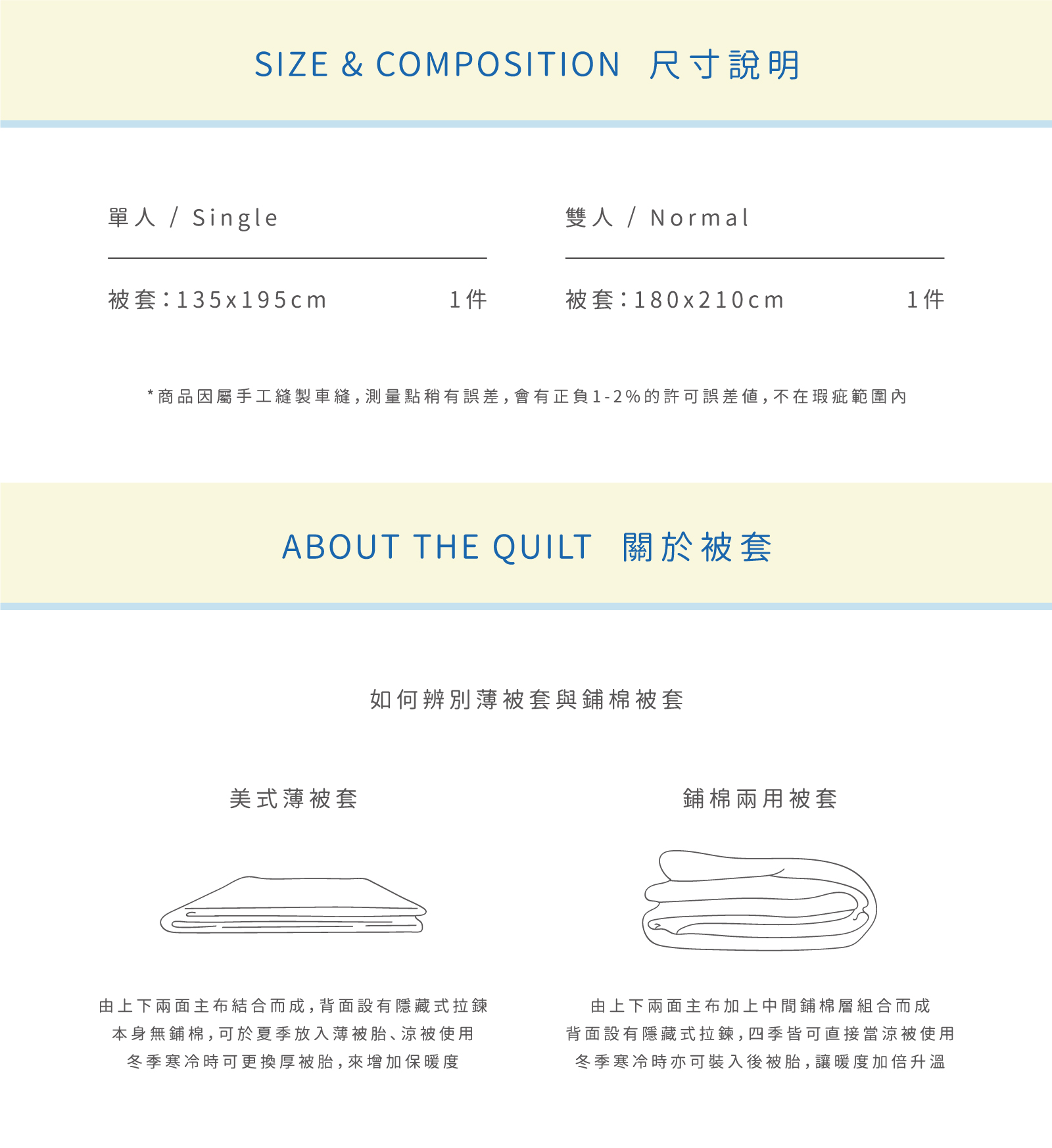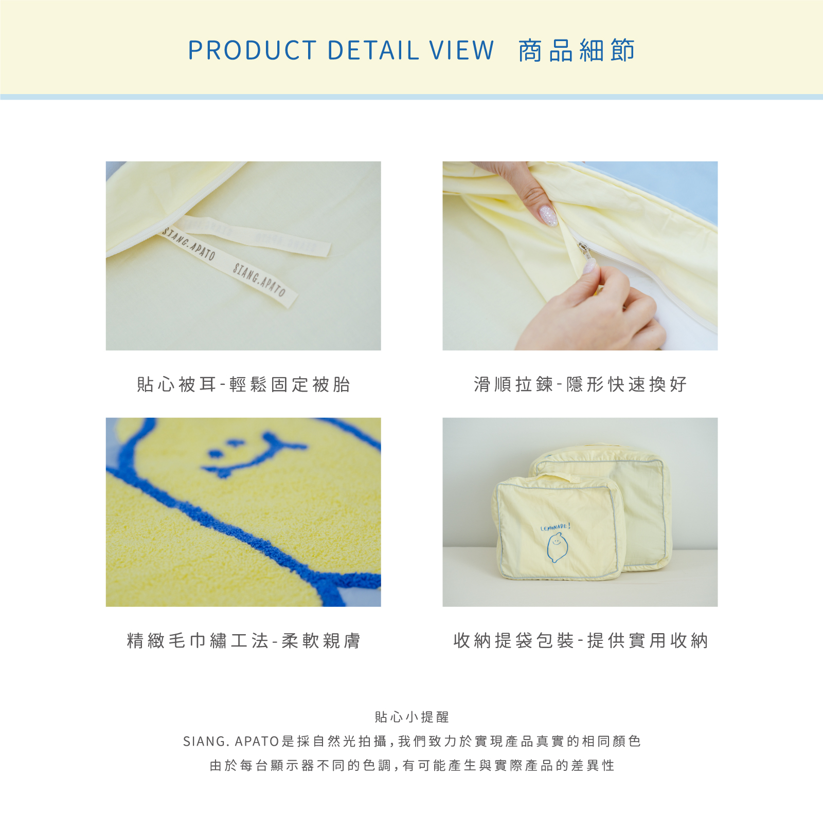 LEMONADE - 60支長纖棉被套 / Second Morning 正版授權 NT$4,560 NT$ 2,280 「猜猜看誰是世界上最甜的檸檬~?」 ◆ Second Morning 正版授權,100%長絨棉製成 ◆ 表面絲光工藝,觸感滑順、自帶光澤 ◆ 獨特毛巾繡,蓬鬆柔軟 NT$4,560 NT$ 2,280 #棉被#被套#長絨棉 尺寸 單人雙人 規格 薄被套鋪棉兩用被套 床包尺寸 寬 長 高 公分 床包鋪棉 需要 不需要 被套尺寸 寬 長 公分 被套鋪棉 需要 不需要 價格試算 數量 加入購物車 立即購買 優惠活動 聖誕好眠. 長絨棉系列88折 消費滿 990元 即可用優惠價格加購商品 台中購物節合作5倍店家|官網及北屯門市限定! Line詢問 商品細節 尺寸指南 洗滌方式 商品評價(0)