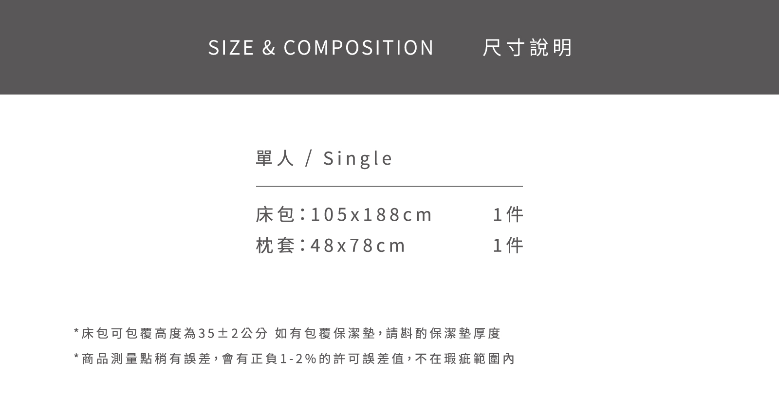 冰原歷險 - 純棉抗菌床包組(床包+枕套) NT$2,760 NT$ 1,380 可國外配送 可國外配送 「準備好一起演出,冰原上的華麗冒險。」 ◆ 100% Cotton 40支精梳純棉,透氣柔軟 ◆ Ag+銀離子添加,物理性抗菌除臭 ◆ Made in Taiwan 台灣製造,品質安心 ◆ 本系列僅限單人尺寸(3.5尺) NT$2,760 NT$ 1,380 #精梳棉#床包組#單人床包#兒童 床包尺寸 寬 長 高 公分 床包鋪棉 需要 不需要 被套尺寸 寬 長 公分 被套鋪棉 需要 不需要 價格試算 數量 加入購物車 立即購買 優惠活動 柔暖耐磨|精梳純棉.華爾紗系列9折 消費滿 990元 即可用優惠價格加購商品 翔仔居家感恩回饋全館滿額禮 ( 數量有限,贈完為止 ) Line詢問 商品細節 尺寸指南 洗滌方式 商品評價(0)