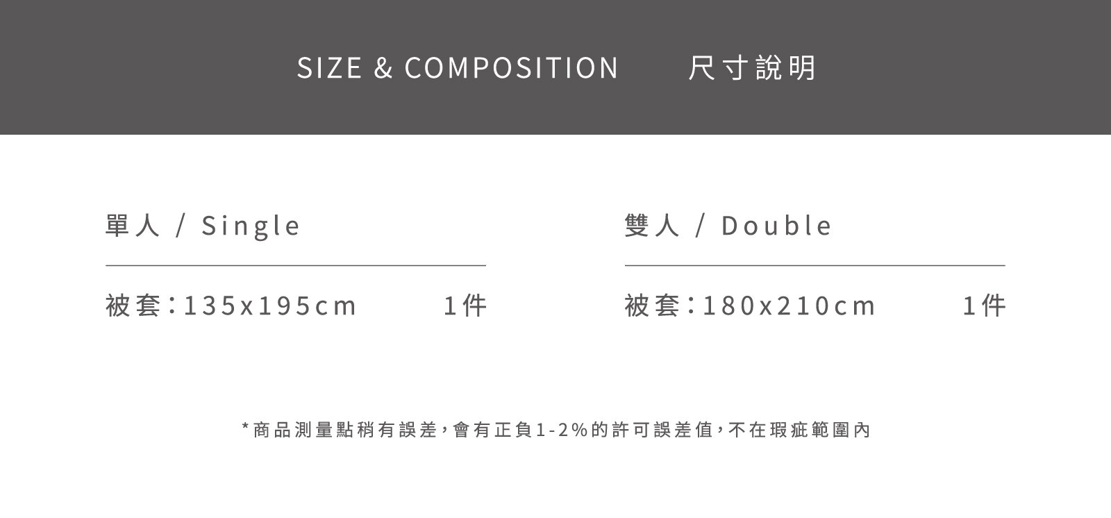 椿嶼 - 純棉被套 NT$2,260 NT$ 735 可國外配送 Outlet挖寶區65折 可國外配送 「宛若春日清晨,無比清新的氣息。」 ◆ 100% Cotton 40支精梳純棉,透氣柔軟 ◆ Made in Taiwan 台灣製造,品質安心 ◆ 被套內裡附被耳,被胎不跑位 NT$2,260 NT$ 735 #精梳棉#棉被#被套 尺寸 單人雙人 規格 薄被套鋪棉兩用被套 床包尺寸 寬 長 高 公分 床包鋪棉 需要 不需要 被套尺寸 寬 長 公分 被套鋪棉 需要 不需要 價格試算 數量 加入購物車 立即購買 優惠活動 消費滿 990元 即可用優惠價格加購商品 翔仔居家感恩回饋全館滿額禮 ( 數量有限,贈完為止 ) Line詢問 商品細節 尺寸指南 洗滌方式 商品評價(1)