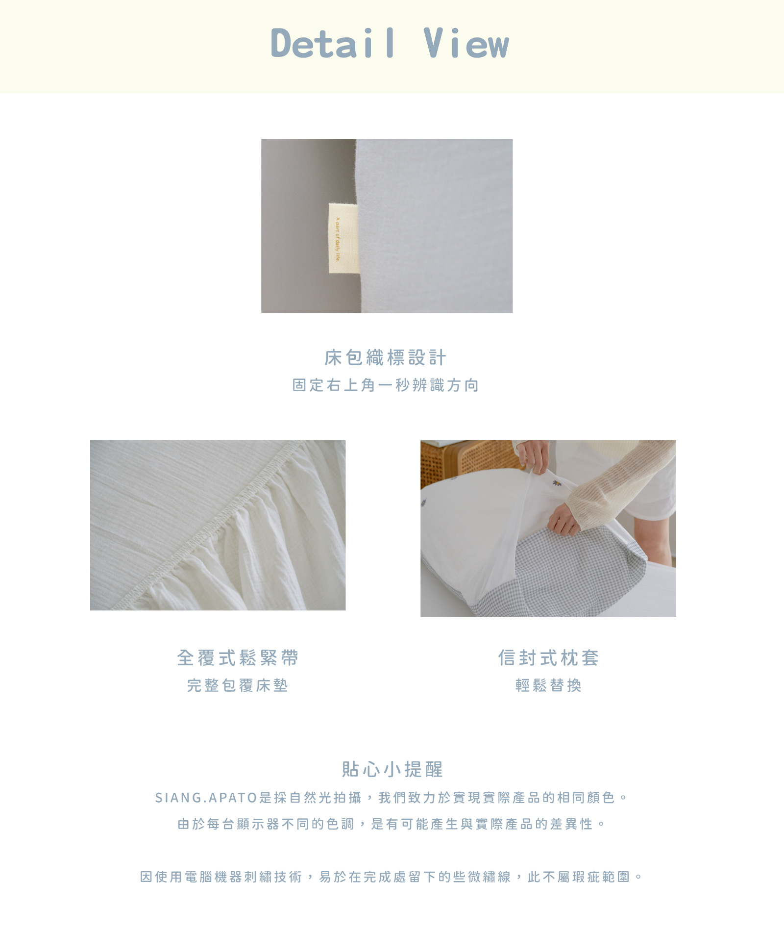 花漾 - 二重紗 / 雙層紗床包組 ( 素色床包 + 刺繡枕套 ) NT$4,160 NT$ 2,080 可國外配送 可國外配送 「最美好的時光是,當花開滿整片山丘。」 ◆ 100% Cotton 長絨綿花製成,細緻耐用 ◆ 二重紗/雙層紗材質,蓬鬆透氣、貼身柔軟 ◆ Made in Taiwan 台灣製造,品質安心 NT$4,160 NT$ 2,080 #二重紗(雙層紗)#床包組#單人床包#雙人床包#雙人加大床包#雙人特大床包#刺繡#素色 尺寸 單人雙人加大特大 床包尺寸 寬 長 高 公分 床包鋪棉 需要 不需要 被套尺寸 寬 長 公分 被套鋪棉 需要 不需要 價格試算 數量 加入購物車 立即購買 優惠活動 消費滿 990元 即可用優惠價格加購商品 台中購物節合作5倍店家|官網及北屯門市限定! Line詢問 商品細節 尺寸指南 洗滌方式 商品評價(0)