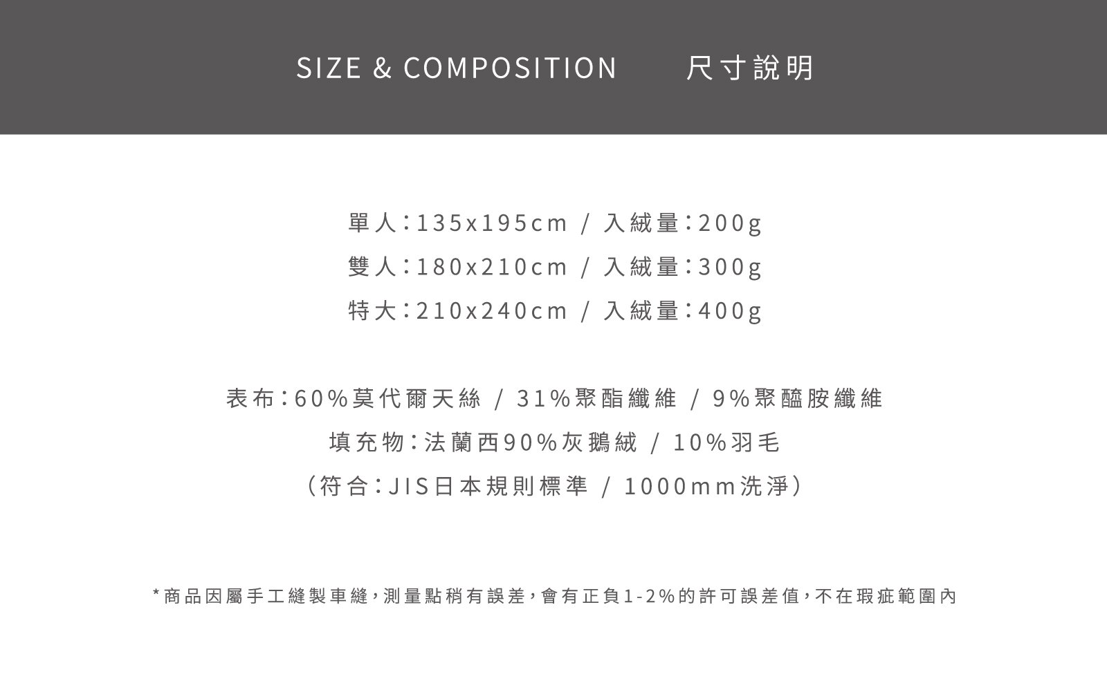 ◆ 通過JIS日規標準,650FP蓬鬆輕盈 ※入絨量:單人200g、雙人300g、特大400g ※本產品建議搭配被套使用