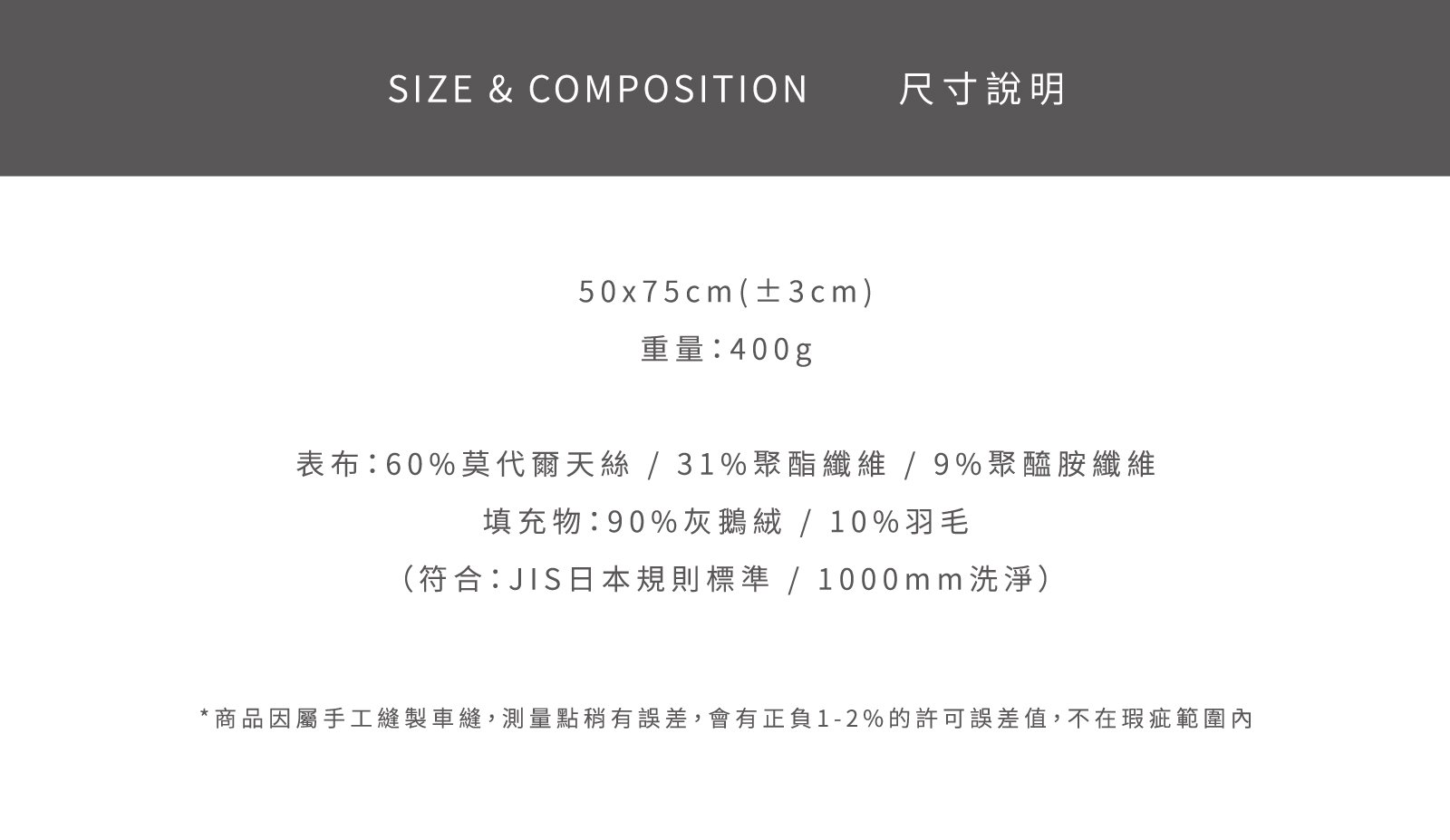 新品 羽絨枕 - 頂級灰鵝絨枕 / 9010 NT$8,560 NT$ 4,280 不可超取 可國外配送 不可超取 可國外配送 「被發現老是離不開被窩的秘密了。」 ◆ 表布: 60%莫代爾 + 40%超細纖維 (450T) ◆ 填充: 90% 羽絨(頂級灰鵝絨) + 10%羽毛 ◆ 飯店級柔軟感受,建議搭配硬枕使用 NT$8,560 NT$ 4,280 #羽絨枕#枕頭 床包尺寸 寬 長 高 公分 床包鋪棉 需要 不需要 被套尺寸 寬 長 公分 被套鋪棉 需要 不需要 價格試算 數量 加入購物車 立即購買 優惠活動 消費滿 990元 即可用優惠價格加購商品 台中購物節合作5倍店家|官網及北屯門市限定! Line詢問 商品細節 尺寸指南 洗滌方式 商品評價(0)