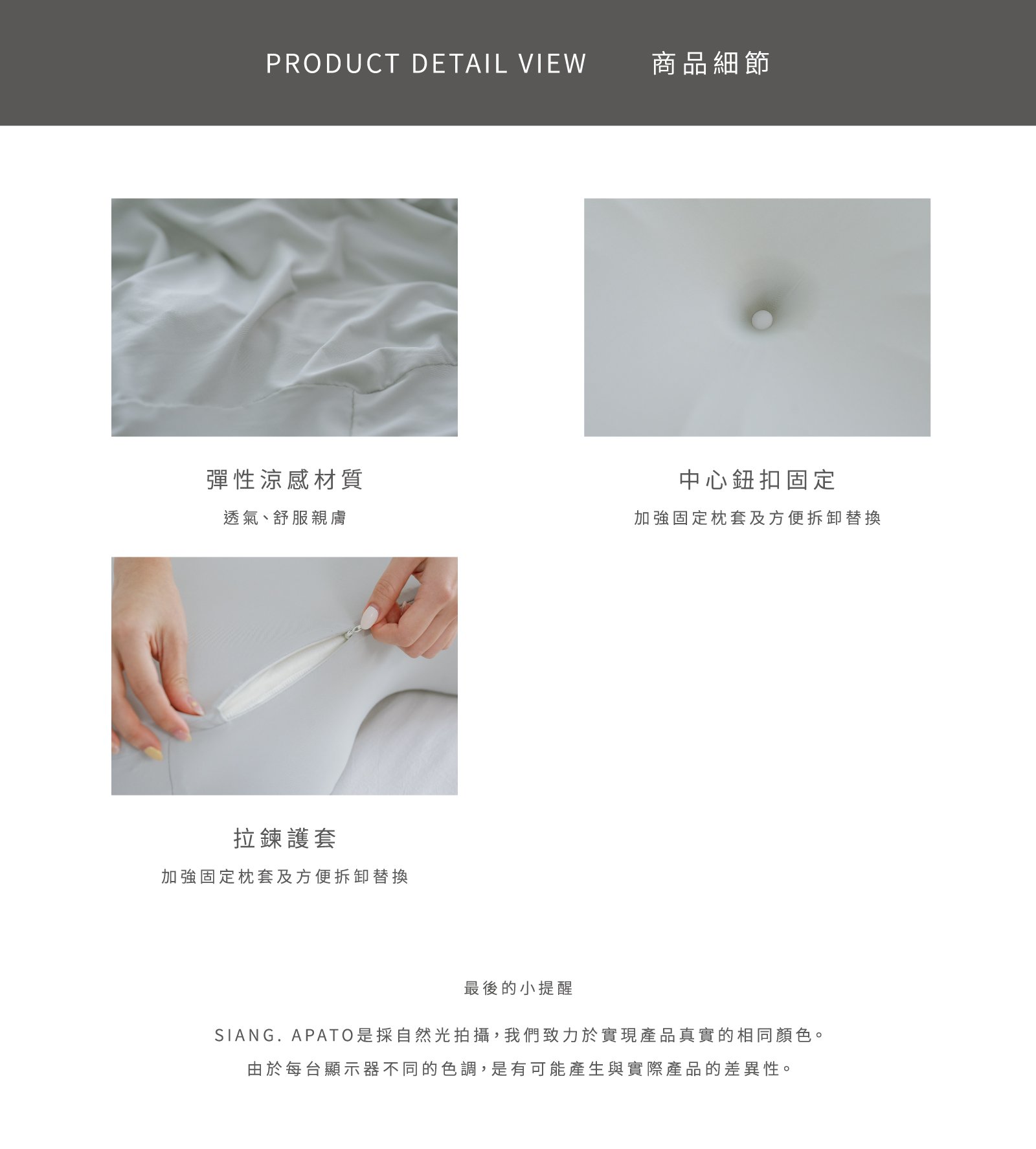 新品 Multi日好眠枕套 / 1入組 NT$1,360 NT$ 680 可國外配送 可國外配送 「願你日日好眠,每一天都神采奕奕。」 ※本產品為Multi日好眠枕專用枕套 ◆ 涼感材質,有效降溫 ◆ 親膚透氣,夏日必備 ◆ 枕套可水洗,清潔方便 NT$1,360 NT$ 680 #枕套#涼感#枕頭 尺寸 靜謐藍晨霧灰 床包尺寸 寬 長 高 公分 床包鋪棉 需要 不需要 被套尺寸 寬 長 公分 被套鋪棉 需要 不需要 價格試算 數量 加入購物車 立即購買 優惠活動 消費滿 990元 即可用優惠價格加購商品 台中購物節合作5倍店家|官網及北屯門市限定! Line詢問 商品細節 尺寸指南 洗滌方式 商品評價(0)