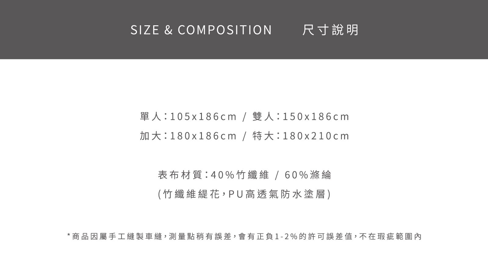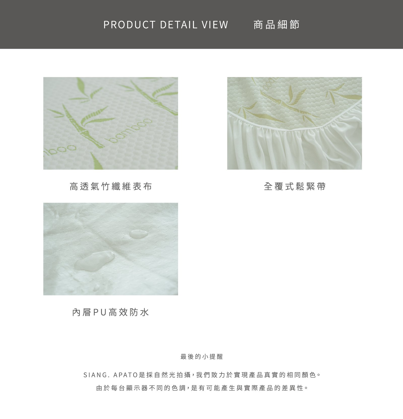 新品 竹纖維透氣防水保潔墊 NT$1,500 NT$ 750 可國外配送 可國外配送 「打造生活的同時也選擇了永續。」 ◆ 表布採用40%竹纖維+60%滌綸 ◆ 竹纖維材質,舒適棉柔、涼爽透氣 ◆ PU高透氣塗層,防水防螨 ※可包覆床墊高度35cm內 NT$1,500 NT$ 750 #保潔墊 尺寸 單人雙人加大特大 床包尺寸 寬 長 高 公分 床包鋪棉 需要 不需要 被套尺寸 寬 長 公分 被套鋪棉 需要 不需要 價格試算 數量 加入購物車 立即購買 優惠活動 消費滿 990元 即可用優惠價格加購商品 台中購物節合作5倍店家|官網及北屯門市限定! Line詢問 商品細節 尺寸指南 洗滌方式 商品評價(1)