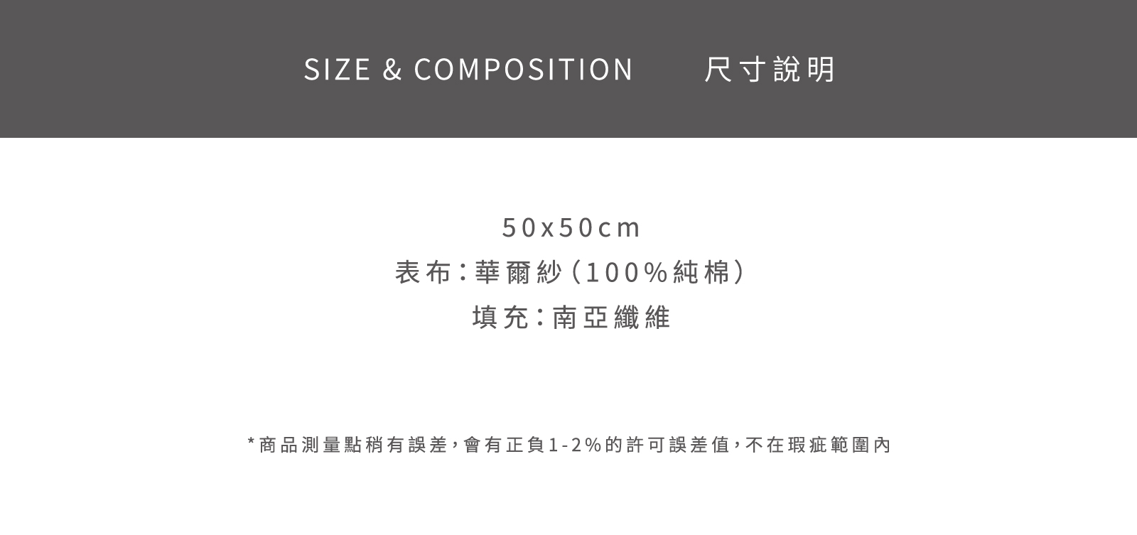 華爾紗 ( 純棉 ) 抱枕 / 50 x 50 cm NT$1,198 NT$ 599 不可超取 可國外配送 不可超取 可國外配送 「優雅、知性、童趣、可愛,我全都要。」 ◆ 100% Cotton 60支長纖棉製成,輕透柔軟 ◆ Made in Taiwan 台灣製造,品質安心 ◆ 尺寸50x50cm,房間、沙發都適用 NT$1,198 NT$ 599 #抱枕#居家小物#長絨棉#華爾紗 尺寸 禾隅picnic暮雨CARS禾隅 / 抱枕套picnic / 抱枕套暮雨 / 抱枕套CARS / 抱枕套 床包尺寸 寬 長 高 公分 床包鋪棉 需要 不需要 被套尺寸 寬 長 公分 被套鋪棉 需要 不需要 價格試算 數量 加入購物車 立即購買 組合內容 華爾紗 ( 純棉 ) 抱枕套:禾隅 x 1抱枕芯 50x50cm: x 1 優惠活動 柔暖耐磨|精梳純棉.華爾紗系列9折 消費滿 990元 即可用優惠價格加購商品 翔仔居家感恩回饋全館滿額禮 ( 數量有限,贈完為止 ) Line詢問 商品細節 尺寸指南 洗滌方式 商品評價(0)