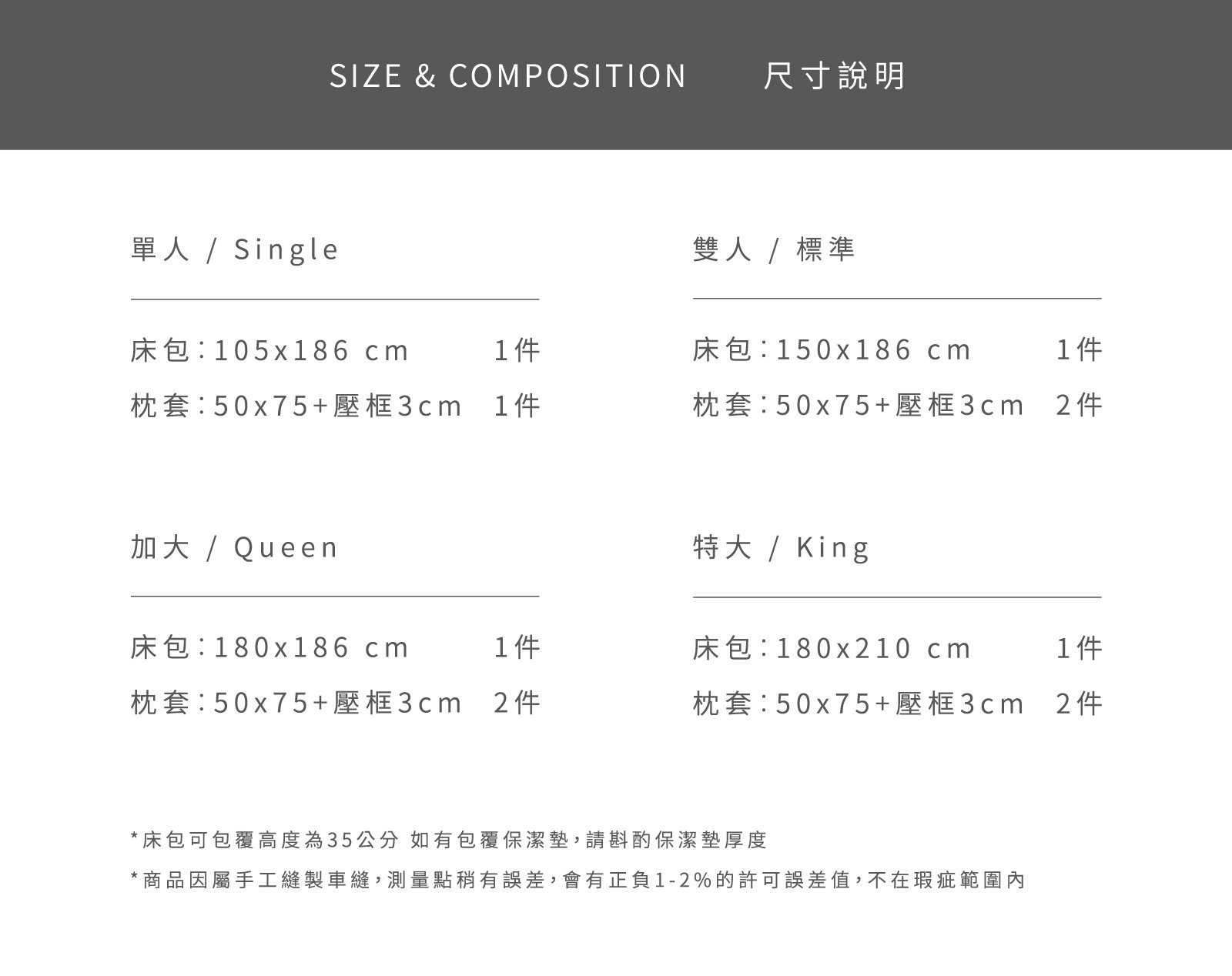Daily - 天絲床包組 ( 床包 + 枕套 ) NT$3,300 NT$ 1,650 可國外配送 可國外配送 NT$3,300 NT$ 1,650 #天絲#床包組#單人床包#雙人床包#雙人加大床包#雙人特大床包 尺寸 單人雙人加大特大 床包尺寸 寬 長 高 公分 床包鋪棉 需要 不需要 被套尺寸 寬 長 公分 被套鋪棉 需要 不需要 價格試算 數量 加入購物車 立即購買 優惠活動 消費滿 990元 即可用優惠價格加購商品 台中購物節合作5倍店家|官網及北屯門市限定! Line詢問 商品細節 尺寸指南 洗滌方式 商品成份 商品評價(1)