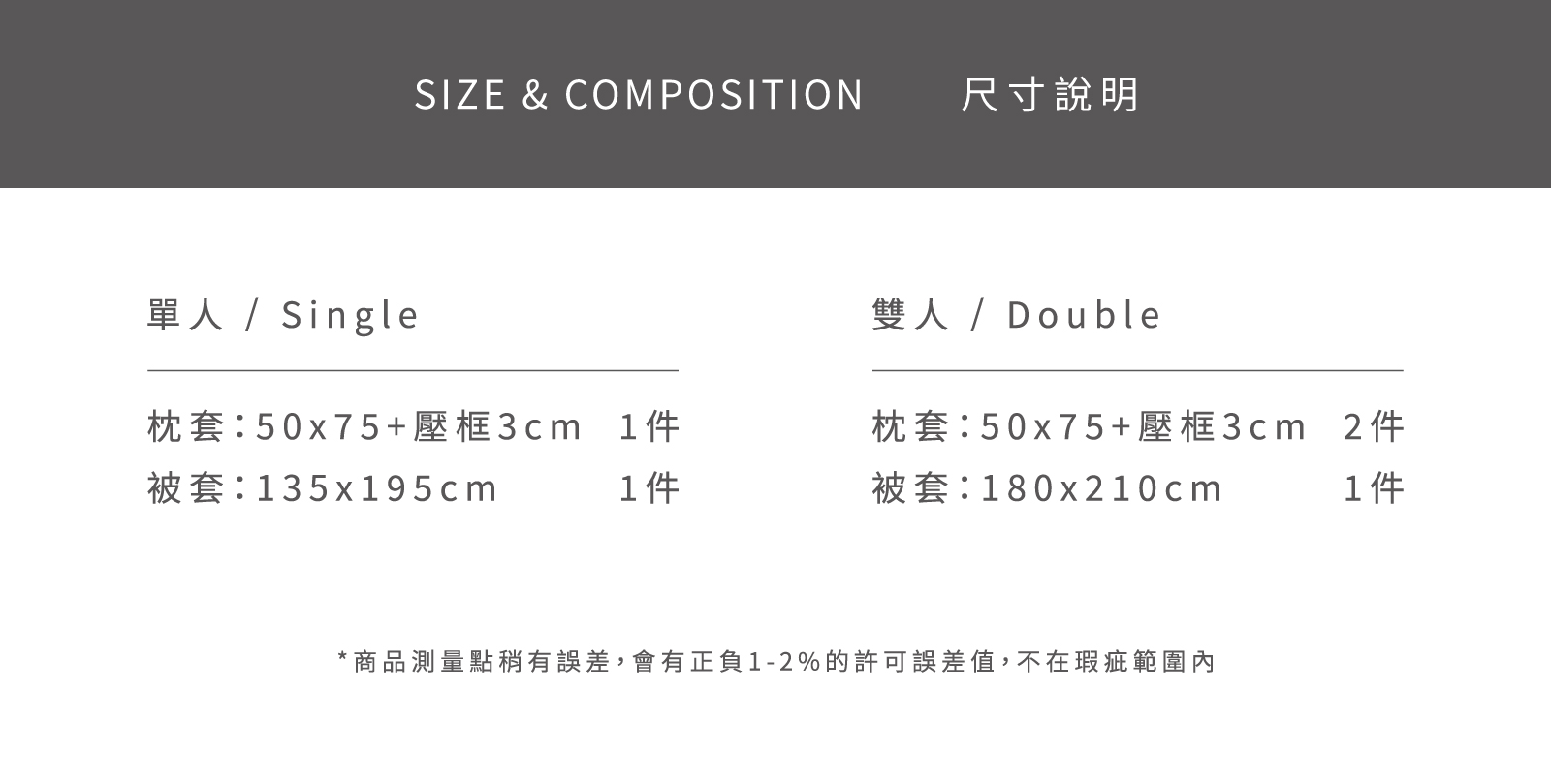 深灰雪松 - 天絲被套組 ( 被套 + 枕套 ) NT$4,560 NT$ 2,280 可國外配送 可國外配送 「Less is more. 極簡主義者的生活美學。」 ◆ 正廠授權100% Tencel 60支天絲™ ,吸濕透氣 ◆ 頂級萊賽爾LF纖維,觸感細緻滑順 ◆ Made in Taiwan 台灣製造,品質安心 NT$4,560 NT$ 2,280 #天絲#棉被#素色 尺寸 單人雙人 規格 薄被套鋪棉兩用被套 床包尺寸 寬 長 高 公分 床包鋪棉 需要 不需要 被套尺寸 寬 長 公分 被套鋪棉 需要 不需要 價格試算 數量 加入購物車 立即購買 優惠活動 消費滿 990元 即可用優惠價格加購商品 翔仔居家感恩回饋全館滿額禮 ( 數量有限,贈完為止 ) Line詢問 商品細節 尺寸指南 洗滌方式 商品評價(12)