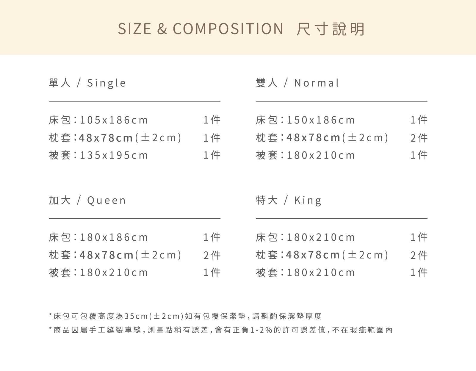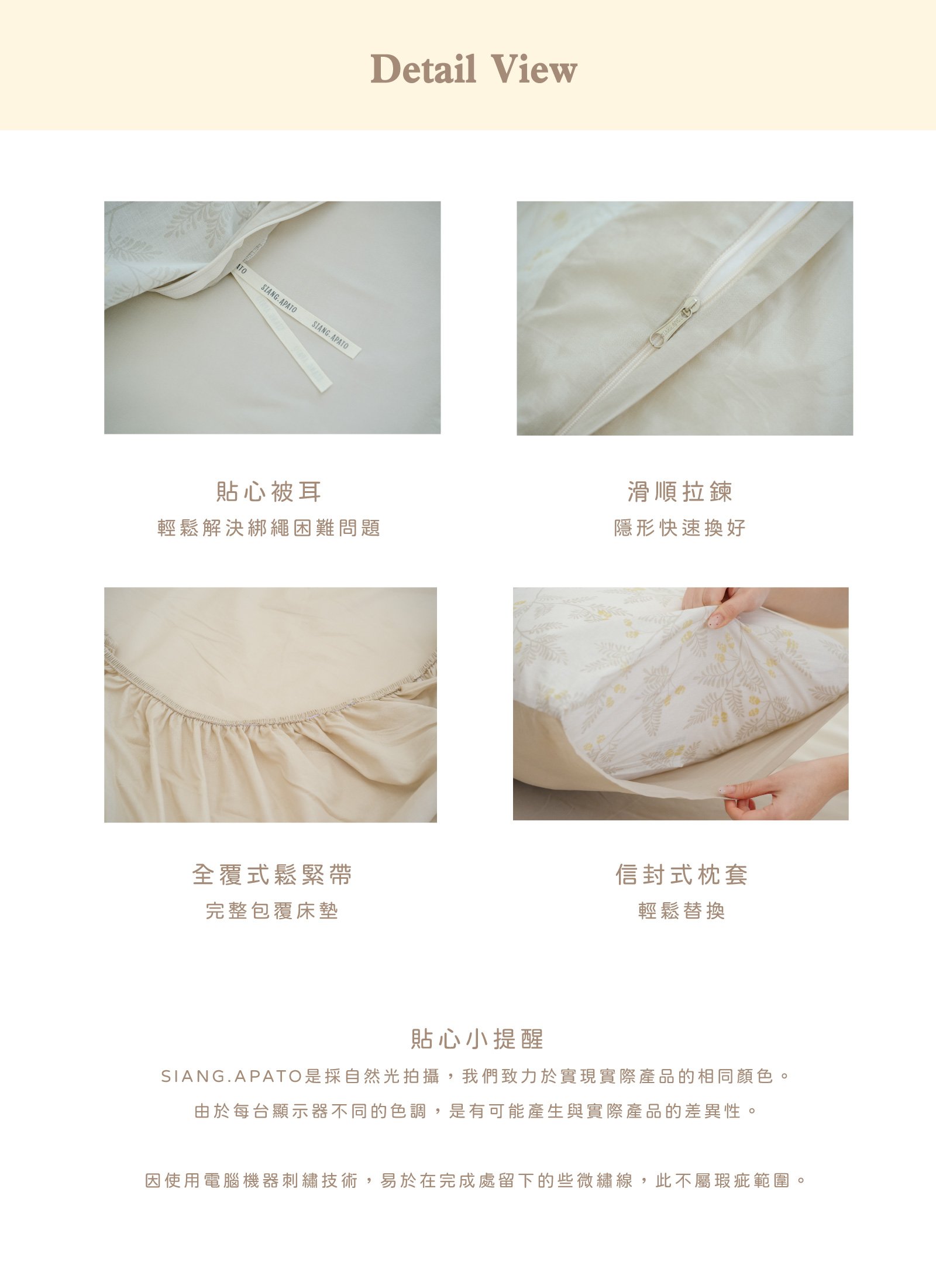 「在靜好時光中,漫漫前行。」 ◆ 100% Cotton 60支長纖棉,輕透柔軟 ◆ Made in Taiwan 台灣製造,品質安心 ◆ 被套內裡附被耳,被胎不跑位