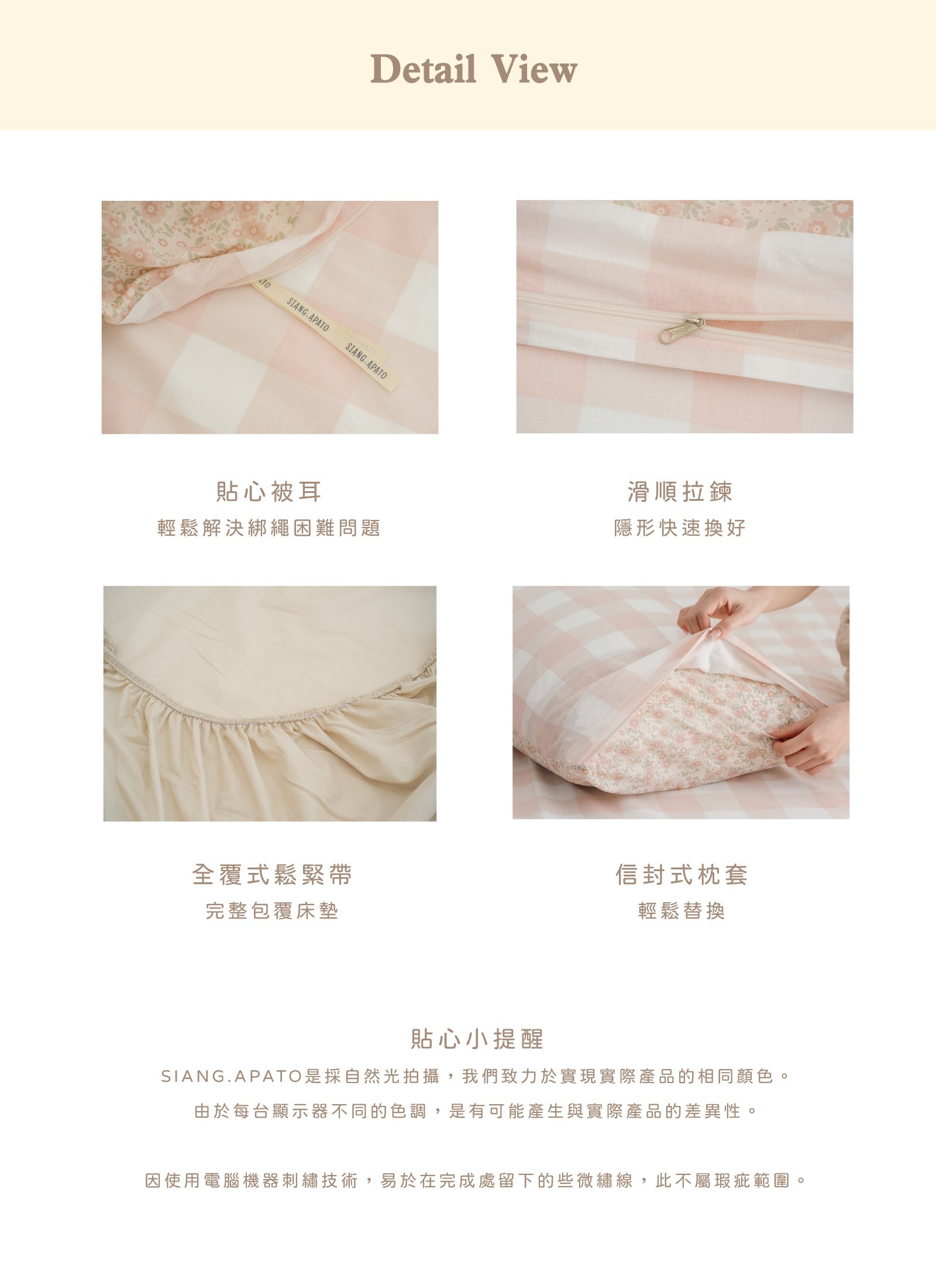 「肉桂捲與紅茶,優雅端起午茶時光。」 ◆ 100% Cotton 60支長纖棉,輕透柔軟 ◆ Made in Taiwan 台灣製造,品質安心 ◆ 被套內裡附被耳,被胎不跑位
