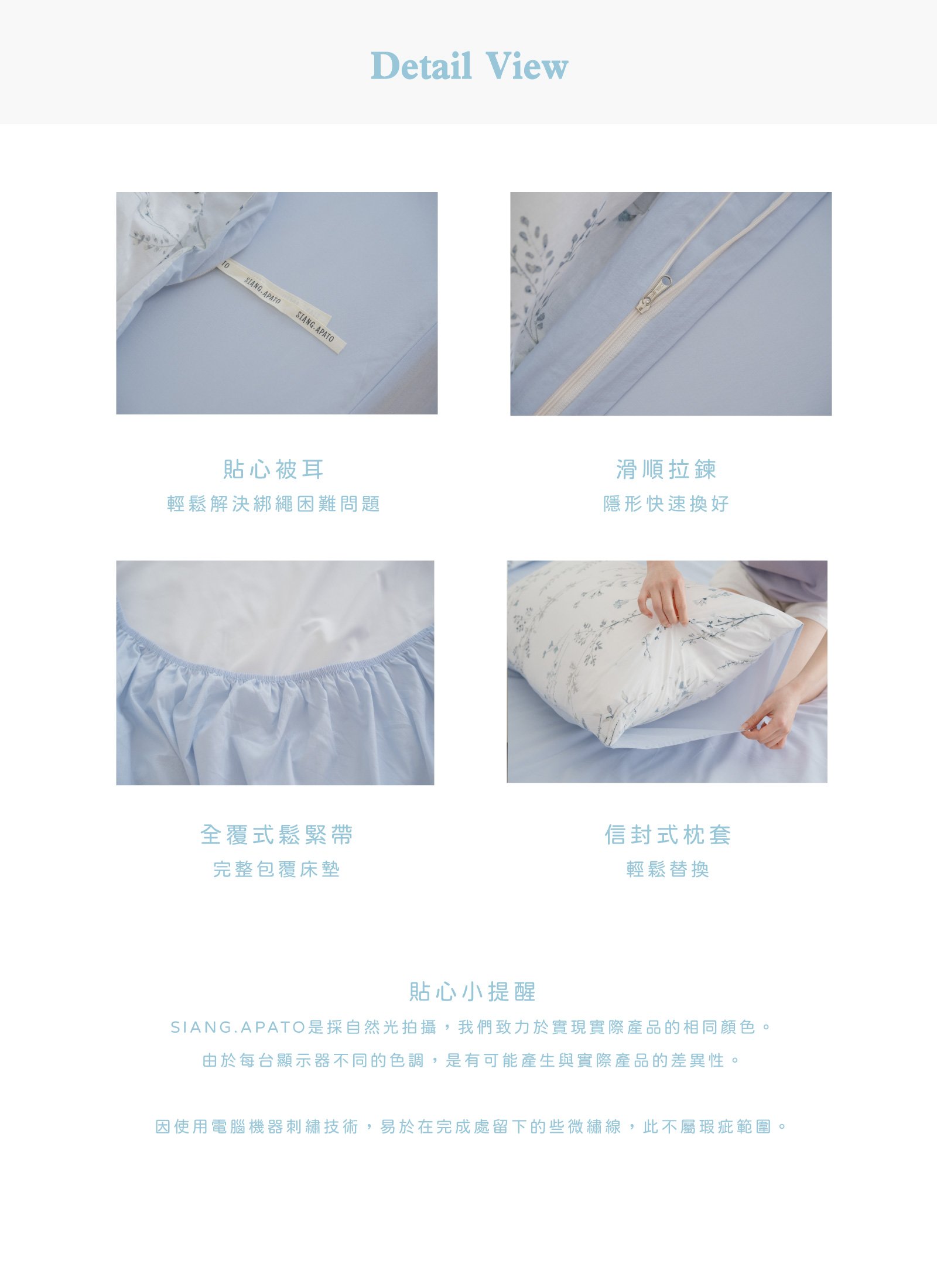 「春風細雨,染成一片藍色想望。」 ◆ 100% Cotton 60支長纖棉,輕透柔軟 ◆ Made in Taiwan 台灣製造,品質安心 ◆ 被套內裡附被耳,被胎不跑位