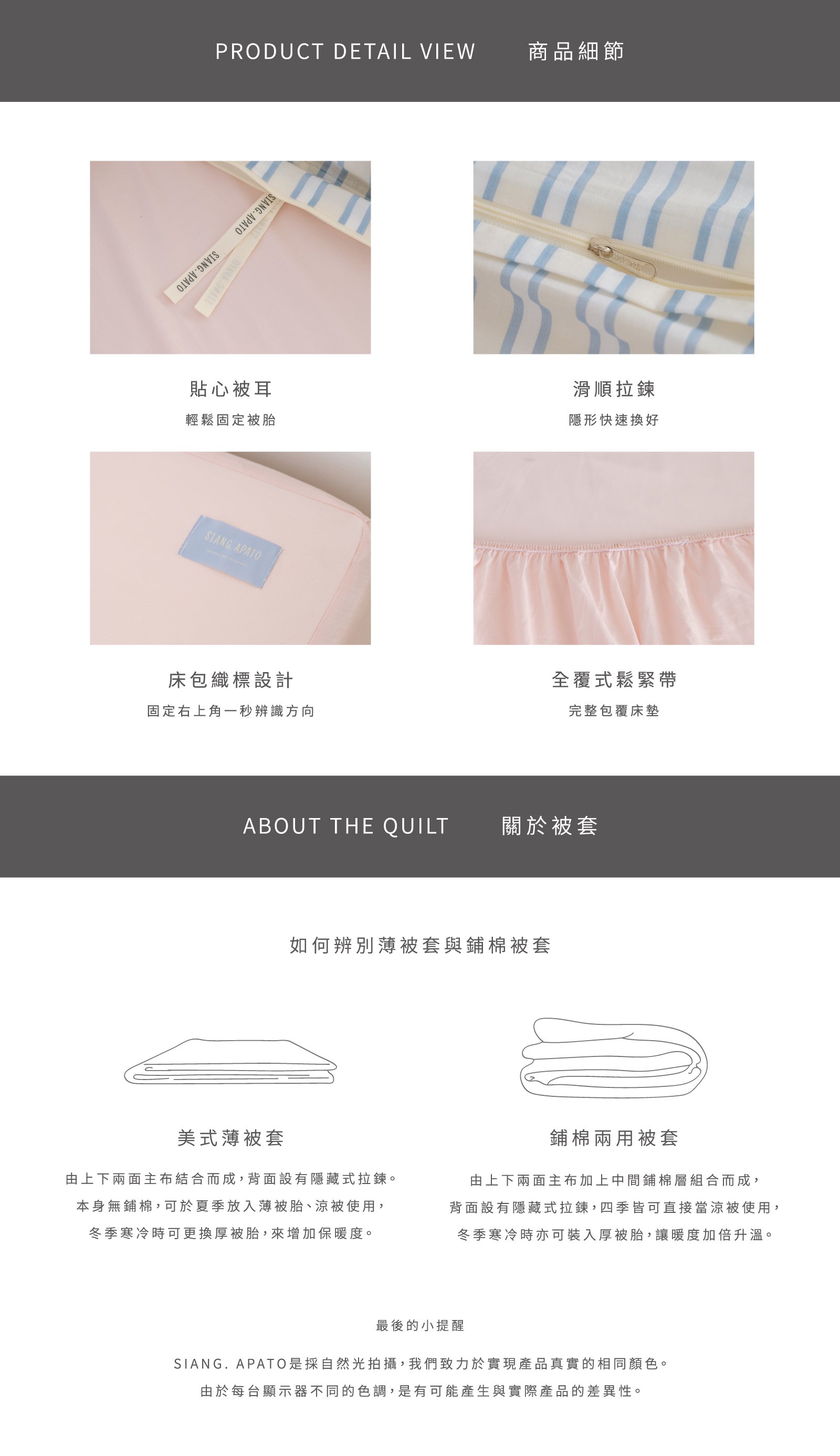 「酸甜可鹽,清爽不膩。」 ◆ 100% Cotton 60支長纖棉,輕透柔軟 ◆ 被套內裡附被耳,被胎不跑位 ◆ Made in Taiwan 台灣製造,品質安心