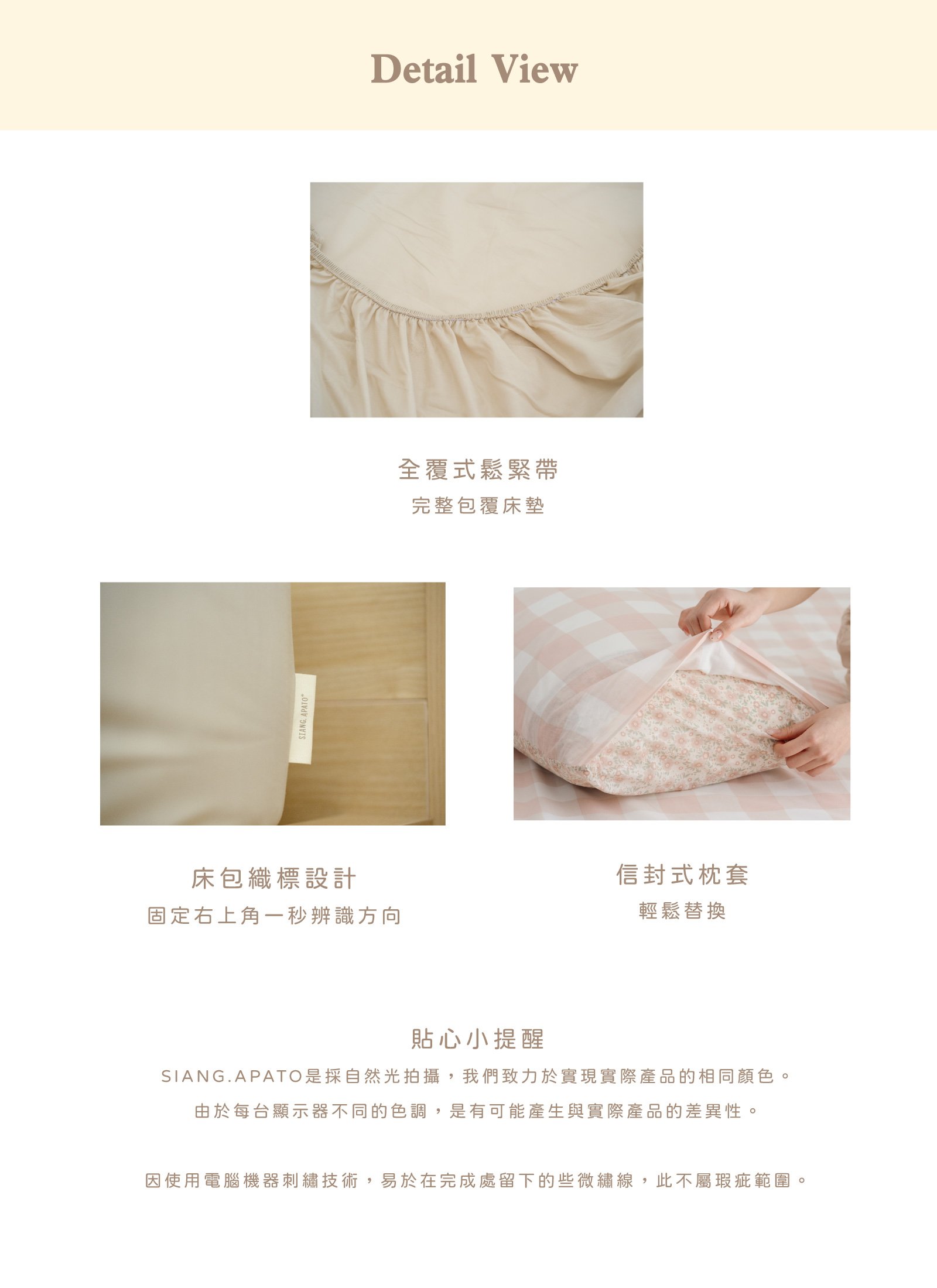 picnic - 華爾紗 ( 純棉 ) 床包組(床包+枕套) NT$2,200 NT$ 1,100 可國外配送 可國外配送 「肉桂捲與紅茶,優雅端起午茶時光。」 ◆ 100% Cotton 60支長纖棉,輕透柔軟 ◆ Made in Taiwan 台灣製造,品質安心 NT$2,200 NT$ 1,100 #床包組#單人床包#雙人床包#雙人加大床包#雙人特大床包#長絨棉#華爾紗 尺寸 單人雙人加大特大 床包尺寸 寬 長 高 公分 床包鋪棉 需要 不需要 被套尺寸 寬 長 公分 被套鋪棉 需要 不需要 價格試算 數量 加入購物車 立即購買 優惠活動 消費滿 990元 即可用優惠價格加購商品 台中購物節合作5倍店家|官網及北屯門市限定! Line詢問 商品細節 尺寸指南 洗滌方式 商品評價(0)